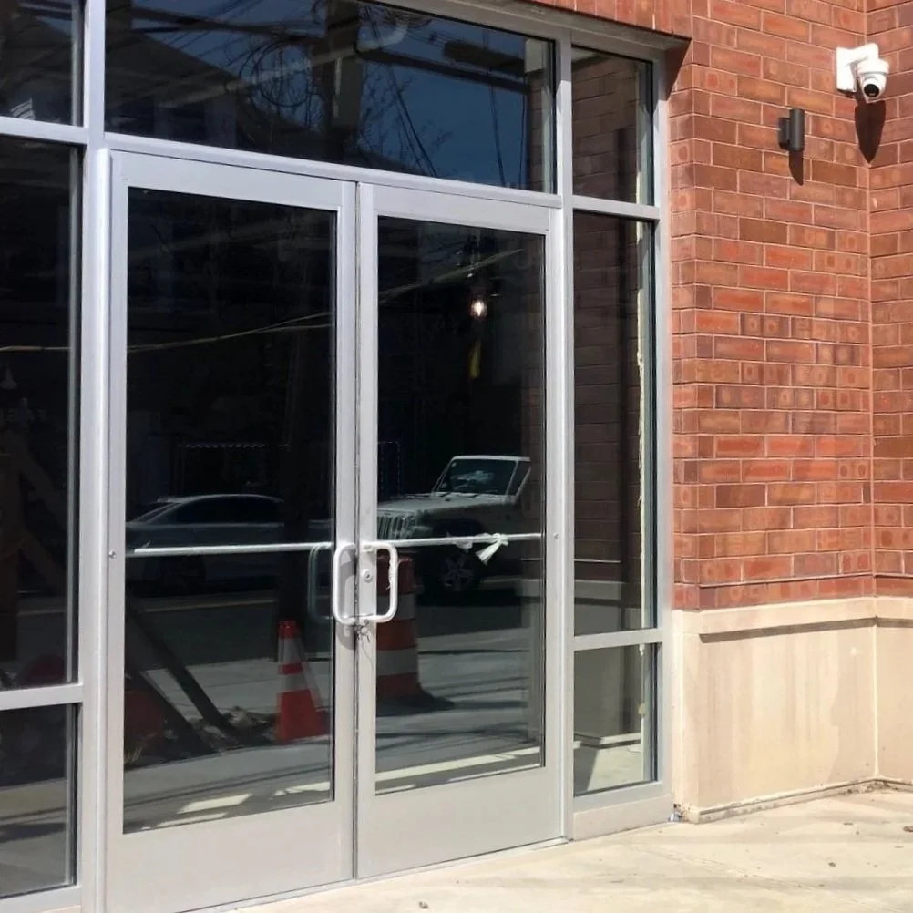Storefront Doors: Aluminum-frame glass doors with commercial hardware, panic bars, and access control integration.