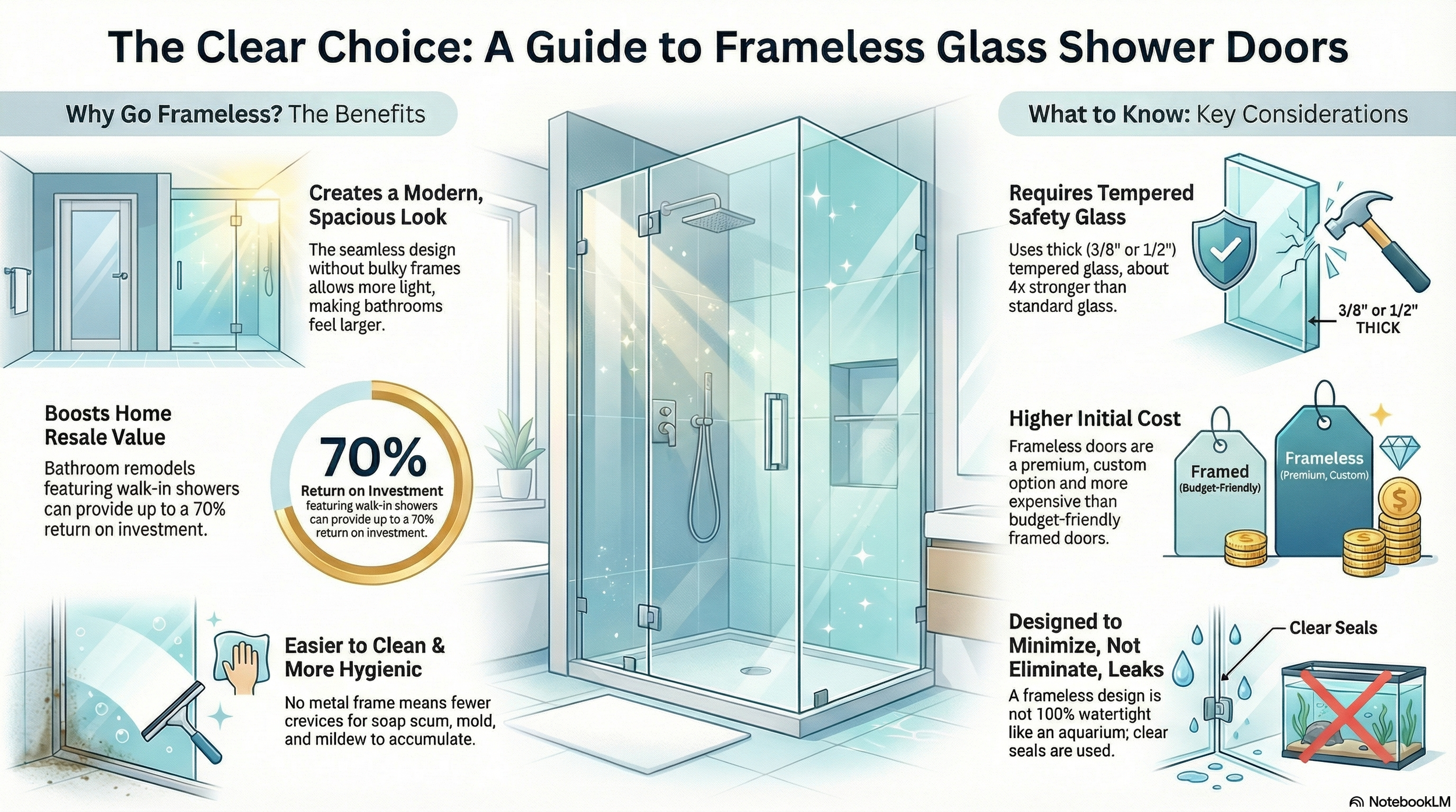 Custom Design Options: Choose from clear, frosted, or low-iron glass, with finishes in brushed nickel, matte black, or chrome.